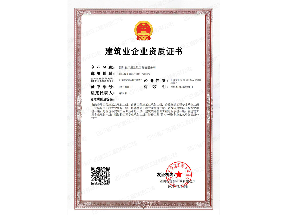 目前,公司建筑工程施工總承包資質已升級為壹級資質,公司有職工280余人,有職稱人員113人(其中高級職稱3人、中級職稱32人、初級職稱78人);各類管理上崗人員40余人;大中專學歷85余人;高中專學歷120余人。企業(yè)法人代表兼總經(jīng)理:謝云君,注冊資金壹億伍仟萬元,下面設有一個分公司“四川省廣進建設工程有限公司赤水分公司”,分公司地址:貴州省遵義市赤水市太平街。
